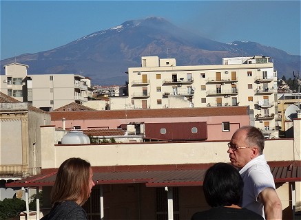 In Rom haben wir eine Stunde Aufenthalt, bevor es nach Catania weitergeht. Dort werden wir am Flughafen abgeholt. Unsere Abholer werden ein Schild "Reisebüro Huber / Fenzl" dabei haben. Das gilt auch für unsere 4 Nachzügler, die erst um 19:10 in Catania eintreffen werden. Wo wir uns dann zum Abendessen treffen, ist noch offen. Der erste Abend wird sicherlich ein großes Hallo! werden, aber wir sollten's nicht übertreiben, denn am nächsten Morgen geht's pünktlich um 9:00 Uhr los zum Ätna und nach Taormina ... Die Wettervorhersage ist übrigens nicht schlecht: Zwischen 14 und 21 Grad, mit einer max. Regenwahrscheinlichkeit von 30% gleich morgen, ansonsten sonnig! |