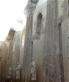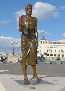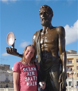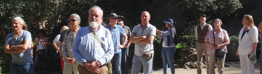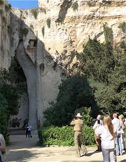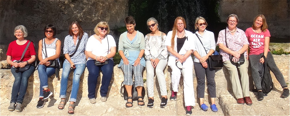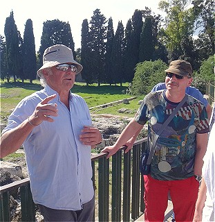 Unser letzter Tagesausflug führte uns nach Syracus. Das Castello Eurialo, das unsere Sizilien-Kenner Willi und Jürgen vorgeschlagen hatten, war leider schon die ganze Saison über geschlossen. Trotzdem legte unser Busfahrer Luca dort einen kurzen Stop ein. Jürgen konnte uns hier (vor dem geschlossenen Tor) erklären, welch überragende Bedeutung das antike Syracus zu Zeiten von Dionysios I. hatte. Die anschließende Besichtigung der "Neapolis" räumte etwaige Zweifel daran vollends aus: Der Steinbruch mit dem "Ohr des Dionysios", das Griechische Theater, das römische Amphitheater, alles sehr eindrucksvoll! Auf der Halbinsel Ortigia gab's dann noch eine kurze Führung durch den Dom, der im 7. Jh. um den Athena-Tempel herum gebaut wurde. Nach der - individuellen - Mittagspause fanden sich (fast) alle wieder pünktlich am Bus ein. |