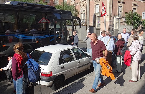 Der größte Teil unserer Gruppe reiste gemeinsam an. Per Sammeltransfer wurden wir in unser Hotel gebracht, und hier warteten bereits Arntraud und Toni auf uns. Die waren schon 2 Tage vor uns angekommen und hatten Catania bereits ausgiebig erkundet. Inclusive Busverbindungen! Und so hieß es kurz nach unserer Ankunft: Wir nehmen den 429er-Bus, und dann schauen wir uns Catania an. Gesagt, getan! Zwar fuhr der Bus erst mal ewig hin und her, aber nach einer guten halbe Stunde kamen wir in Downton-Catania an und Toni übernahm die Führung durch's nächtliche Catania. |