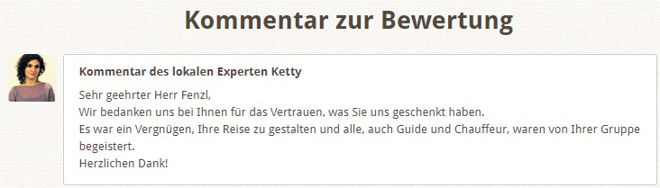 Heutzutage ist es ja üblich, dass man nach jeder "Bestellung" einen Feedback-Fragebogen vom Lieferanten bekommt, um das Gelieferte zu bewerten. So war es auch im Fall unserer Abi-Reise, und ich habe den beteiligten Agenturen Evaneos und Mandala-Tour sehr gerne ein sehr positives Feedback gegeben. Denn es hat ja alles wunderbar geklappt! |