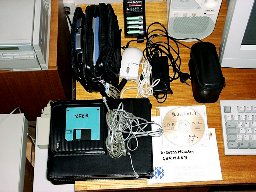 Die Kamera speichert ihre Bilder auf Compact- Flash- Karten (o. Abb.). Die lassen sich wiederum direkt in den PC-Card-Slot des Notebooks einführen, so dass die Bilder dann "ratzfatz" auf der Festplatte sind. Jetzt braucht's nur noch ein Telefonkabel und einen entsprechenden Telefon-Anschluss (beides o. Abb.), und schon kann ich das Material weltweit verbreiten ... Soweit die Theorie ... |