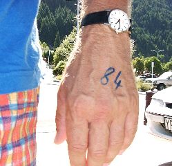 auf dem linken Handrücken ihr aktuelles Sprunggewicht aufgemalt.