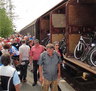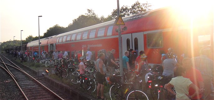 Fast schon langweilig: Auch an diesem letzten Morgen schien die Sonne. Seit dem Aufstehen herrschte Abschieds-Stimmung. Vor allem die langjährigen Teilnehmer lagen sich in den Armen: "Schee, dass ma uns wieder 'troffen ham", "dann bis nächst's Jahr"... Mit der Verladung von ca. 1000 Radln und Radlern samt Gepäck auf 2 Sonderzüge stand aber noch eine gewisse Herausforderung an: da die Züge länger sind als die Bahnsteige, musste mehrfach vor- und zurück gesetzt werden. So mancher Teilnehmer konnte sich hier zwischen Sitzplatz reservieren, Radl samt Gepäck verstauen und Reiseproviant einkaufen noch den finalen Adrenalin-Kick holen. Mit mäßiger Verspätung ging's dann los, aussteigende Radler-Gruppen verabschiedeten sich mit kleinen "La Ola"-Wellen, und Flori und ich kamen pünktlich und unspektakulär wieder in Pasing an. Fazit: Es war eine BR-Radltour, wie man sie besser wohl nicht erwischen kann. Uns hat sehr Vieles sehr gut gefallen, die enormen organisatorischen Leistungen haben uns schwer beeindruckt, und es war toll, mal dabei gewesen zu sein. Ob wir zu "Wiederholungs-Tätern" werden? Ich weiß es noch nicht ... |