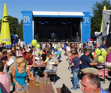 Anreise, Check-In und Auftakt-Veranstaltung mit Andreas Bourani Der Sonderzug kam zur Mittagszeit in Pasing an, und wir hatten ja nur eine einzige Station bis Weilheim zu fahren, während andere Radltour-Teilnehmer aus Franken schon seit dem frühen Morgen im Zug saßen. Die Stimmung war von Anfang an prächtig, denn für die ganze Radltour-Woche ist hochsommerliches Wetter angesagt. So empfing uns auch Weilheim bei strahlendem Sonnenschein, der Check-In war schnell erledigt und der Blick in unsere erste Übernachtungshalle war zwar nicht berauschend, aber auch nicht unerwartet. Auf dem Festplatz waren 2 Bühnen und jede Menge Info- und Verpflegungsstände aufgebaut. Für die musikalische Eröffnung sorgten die Cagey-Strings, der Top-Act des Abends war Andreas Bourani. Danach legte Tom Glas bis Mitternacht auf, während auf der anderen Seite des Platzes bereits der Abbau der Hauptbühne in vollem Gange war. Die gesamte BR-Radltour ist ein logistischer Kraftakt. |