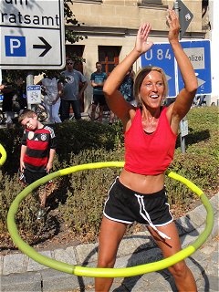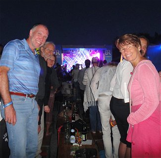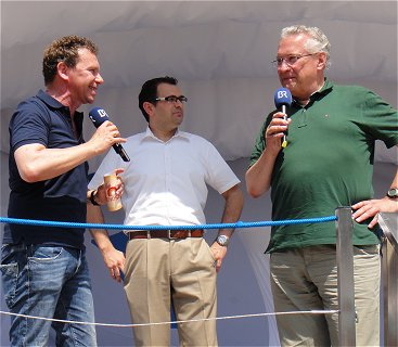 Abend-Veranstaltung mit Claudia Koreck Nach dem gestrigen musikalischen Highlight war heute mit Sicherheit das Hitze-Highlight der gesamten BR-Radltour 2015. Bis zu 40 Grad waren es wohl! Ein paar Grad hin oder her sollten keinen großen Unterschied mehr machen, denkt man, aber es war deutlich noch heißer als gestern. Der Veranstalter hat's berücksichtigt und auf der Nachmittagsetappe sämtliche Dorf-Feuerwehren mobilisiert, um uns mit "Hydro-Wänden" Abkühlung zu verschaffen. Außerdem gab's wegen der extremen Temperaturen einen außerordentlichen Nachmittags-Wasserstopp in Sommerach. Regional bedingt gleich in Verbindung mit einer Weinprobe (!). Uns hat's gefallen - und den meisten anderen BR-Radlern auch. Am Abend stand Claudia Koreck auf dem Musik-Programm, und es wurde wieder eine tolle Hochsommer-Feten-Nacht auf dem ganz besonders lauschigen Volkacher Festplatz. |