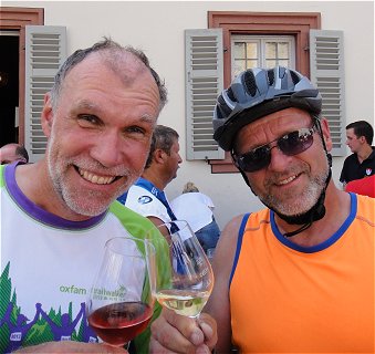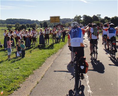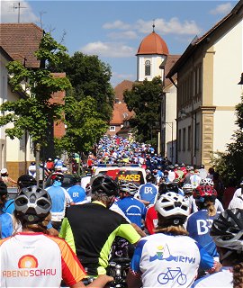 Finale und Abend-Veranstaltung mit Spider Murphy Gang Der Start zur letzten Etappe gestaltete sich schwieriger als erwartet. Nein, es lag nicht an ermatteten oder überzechten Radlern, sondern an der Frühstücks-Logistik in der Mainfranken-Kaserne (immerhin ein Logistik Bataillon!). Mit über einer halben Stunde Verspätung ging's dann doch los, an Weinbergen vorbei und nach der Wasserpause auf eine endlos scheinende Steigung, an deren Ende aber eine tolle Abfahrt nach Münnerstadt winkte. Die Nachmittagsetappe lief dann so gut wie von selbst, in jedem Dorf gab's Blasmusik und Wasserfontänen, und im Zielort Mellrichstadt war die ganze Stadt auf den Beinen, um uns gebührend willkommen zu heißen. Wie jeden Abend trübte auch an diesem kein Wölkchen den blauen Himmel, und heute hörten wir die Spider Murphy Songs, die bisher immer die Cagey Strings gespielt hatten, endlich im Original. Den letzten Abend nutzten wir auch zu unserem ersten Besuch der ProBier-Bar: Hier gab's jeden Abend eine Bierprobe lokaler Brauereien. Eigentlich kurios, dass wir hier keine Stammgäste geworden sind ... |