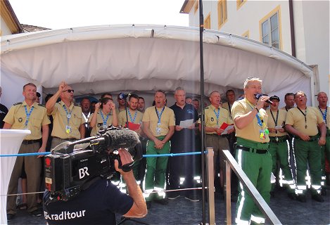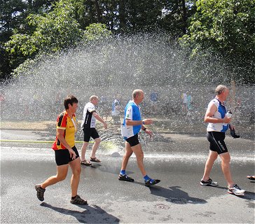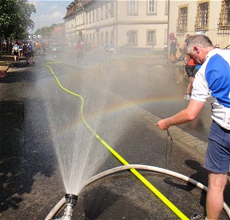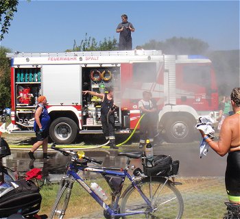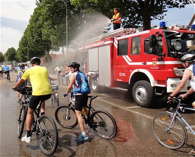 ![]() Flori (links) genießt - wie viele andere - die Wasserdusche der Feuerwehr bei der Ankunft in Donauwörth |