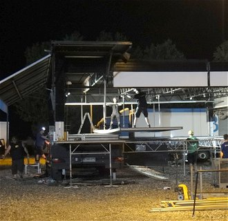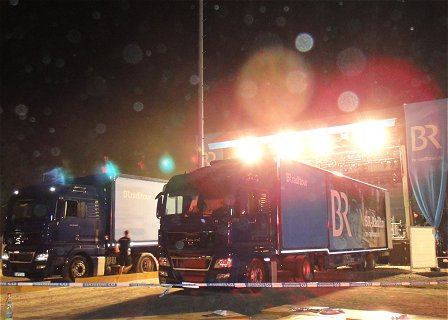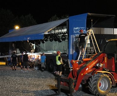 Fast interessanter als der Schlagerabend selbst war aber der Abbau der Hauptbühne. Da unser Quartier heute direkt neben dem Festplatz lag, schauten wir uns das mal an, und tatsächlich: Innerhalb von 2 Stunden ist die Riesenbühne zusammengefaltet und kurz danach auf dem Weg zum Event-Ort des nächsten Tages. Tolle Leistung! |