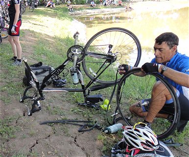 ![]() Bei der Wasserpause gibt's schon erste Reparaturen |