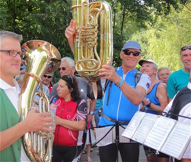 ![]() Der Tuba-Bläser der lokalen Blasmusik muss kurzfristig weg: Kein Problem, ein Radler springt spontan ein! |