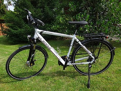 Letztes Jahr war ich ja mit meinem betagten Trekking-Radl (Baujahr 2007) dabei, eigentlich ohne Probleme. Nur beim Runterschalten vor Steigungen musste ich öfters 1x zu oft runter und dann wieder eins rauf schalten, bis die Kette wieder richtig über Zahnkränze und Ritzel lief. Für heuer wäre eine Teilnahme mit dem gleichen Bike durchaus möglich gewesen, aber da ich mir ja sonst nie was gönne, stand ein neues Radl zur Diskussion. Und gestern bin ich beim Radlbauer fündig geworden! Jetzt hab' ich ein neues Gefährt, ein "Epple" (bisher nie davon gehört), in dem angeblich hoch- wertigste Komponenten verbaut sind. Der einzige momentan für mich greifbare Unterschied gegen- über meinem Oldie sind die hydraulischen Scheibenbremsen. Bei allem anderen kann ich mich nur auf die Beteuerungen des Verkäufers verlassen, dass sich die Hochwertigkeit der Komponenten erst in ein paar Jahren zeigen wird. Na ja, schau mer mal ... Beim Lenker hatte ich noch Änderungswünsche: ein steilerer Lenkervorbau und weichere Griffe sollten es sein. Gegen einen moderaten Aufpreis kein Problem! Na gut, technisch bin ich jedenfalls gerüstet für die BR Radltour! |