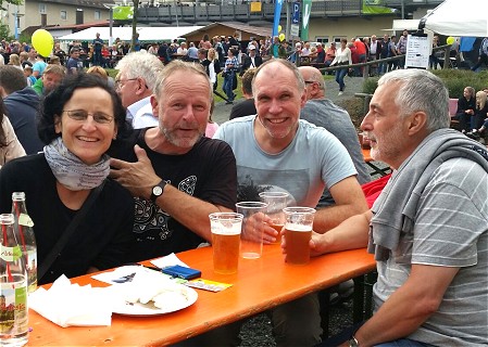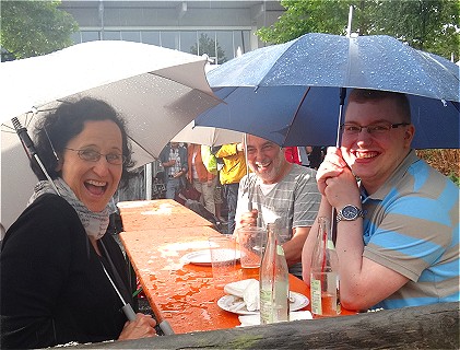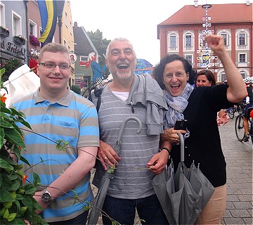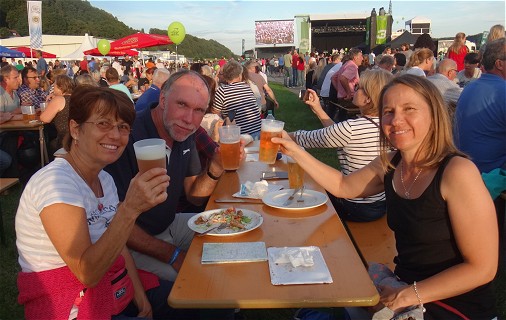 Ein zweiter Guss erreichte dann auch das Partyvolk am Abend, er war aber zum Glück nur von kurzer Dauer, so dass der Abend problemlos und sogar recht sonnig über die Bühne gehen konnte. Highlight war - neben Stephanie Heinzmann - unser Treffen mit Carmen und Siggi (und dessen Sohn Daniel). Die beiden Freunde wohnen ja nur einen Steinwurf von Neustadt weg und waren sowohl bei der Zieleinfahrt am Stadtplatz als auch abends auf dem Festgelände mit dabei. |