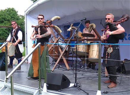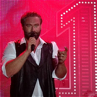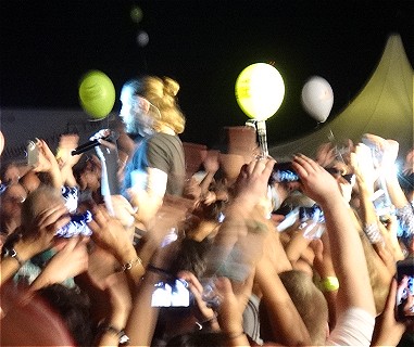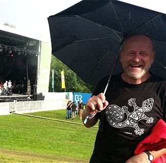 Die restliche Strecke nach Vilshofen war keine Herausforderung mehr. In Vilshofen lief es für Flori und mich aber nun anders als sonst: Wir mussten zwar zunächst zu den Quartieren radeln, aber nur, um dort unsere Taschen abzuholen und die übliche Etappen-Halbe einzunehmen. Dann ging's zurück in die Stadt zur Pension Sagerer. Der Chef wartete schon auf der Straße auf Radltour-Ankömmlinge und so waren wir rasch eingecheckt. Auch bei den kleinen Anfahrtsproblemen unserer Mädels (Stadttor noch gesperrt) leistete Herr Sagerer Unterstützung: Kurzum: die teilweise Auszeit von der Radltour (jedenfalls von deren Massenquartieren) klappte problemlos. Abends pilgerten wir dann natürlich zum Flugplatz auf die andere Seite der Donau rüber. Auf dem riesigen Areal konnte man sich verlaufen, aber es gab ja einen klaren Sammelpunkt: die Bühne, auf der ab 21:00 Rea Garvey den Ton angab. Spektakulärer Höhepunkt: Zum Leidwesen seiner Security warf sich Rea mitten ins Publikum, um seinem Licht-Designer für das tolle Bühnen-Outfit zu danken. |
