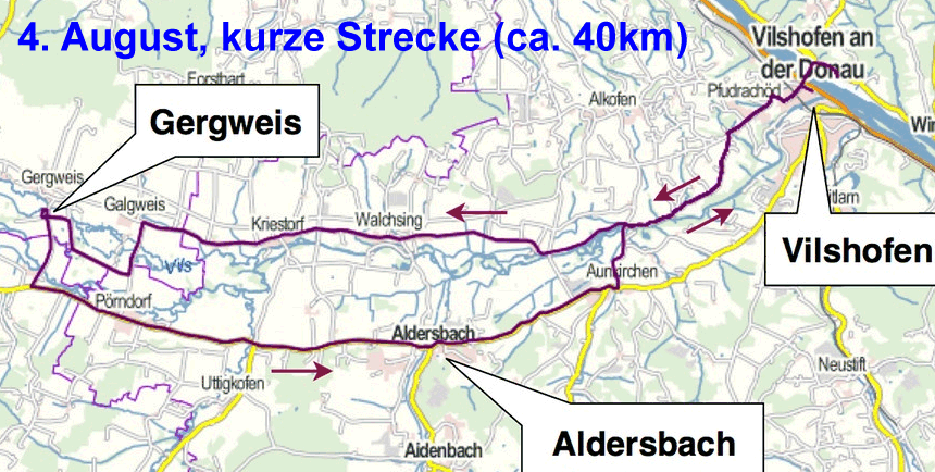 Heute war Super-Sommerwetter angesagt, und zur Rundtour von und nach Vilshofen gesellten sich noch ca. 500 Tages-Radler zur Radltour-Truppe, darunter auch Christina. Es gab 2 Varianten: 40 oder 70 km. Wir entschieden uns für die kürzere. Die bot einen längeren Wasser-Stopp und 3 Stunden Mittagspause im Kloster Aldersbach. |
