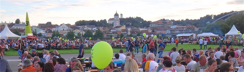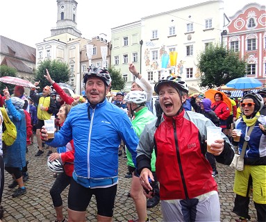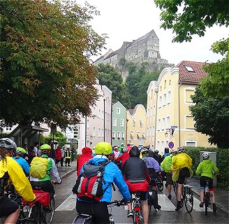 Nach der furiosen Mittagspause lagen noch 40 nasse km bis Burghausen vor uns, aber die packten wir auch noch! Die Annäherung ans Ziel verlief kreisförmig, mit einer finalen Abfahrt in die Altstadt. Dort herrschte Party-Stimmung mit toller Live-Musik von der StreetLiveFamily und (Alk-)Frei-Bier. Zu den Quartieren ging's dann freilich noch mal kräftig nach oben, und eine warme Dusche war für viele zunächst das wichtigste Ziel. Dafür, dass heute nicht mehr alle mitgeradelt sind, war die Turmhalle überraschend gut gefüllt. Zum Silbermond-Konzert ging's abends bei leichtem Regen zu Fuß. Die Regenschirme konnten zugeklappt bleiben, und am Weinzelt flossen schließlich die letzten Schoppen ... |