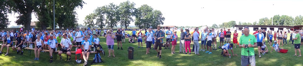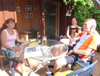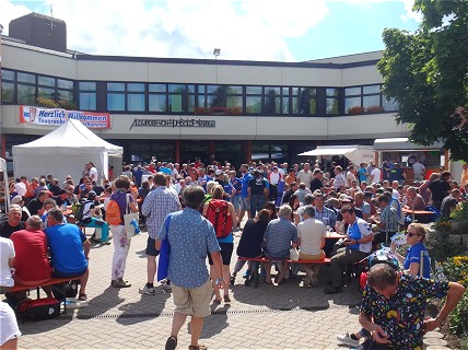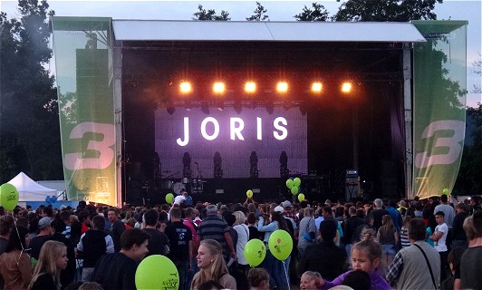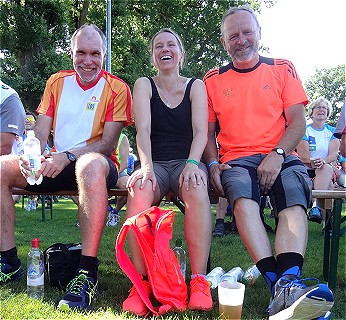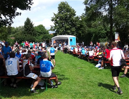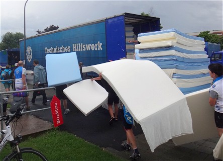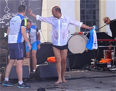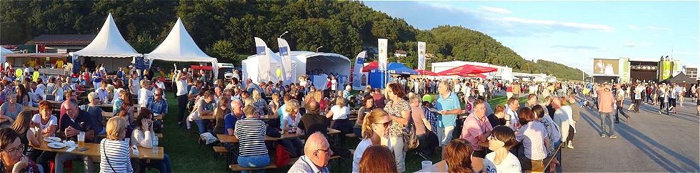 Die Nachmittagsetappe verlief bei bestem Wetter undramatisch, und an den Quartieren herrschte Biergartenstimmung. Abends ging's runter ins Freibade-Gelände, wo die Bühne für Joris am hintersten Ende aufgestellt war. Erst am nächsten Tag erfuhren wir, dass das Event aufgrund der starken Regenfälle der letzten Tage offenbar fast geplatzt wäre, weil das Gelände viel zu aufgeweicht war für die schweren Bühnen-LKWs. In einer spontanen Nachtaktion waren offenbar Hecken und Zäune entfernt, sowie Kies und Rindenmulch aufgeschüttet worden, um die Bühne doch noch aufstellen zu können. Wie aufgeweicht das Gelände war, konnte ich auch selber in Erfahrung bringen: Ein unbeabsichtigter "Touchdown" von der Bierbank sorgte in Sekundenschnelle für einen nassen Hintern. |