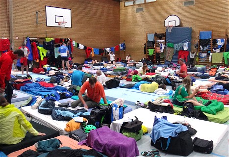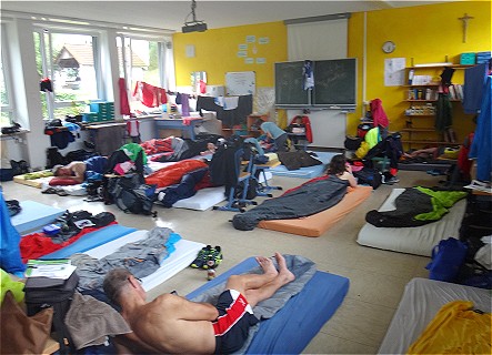 Auf der Nachmittags-Etappe nach Viechtach standen uns noch kräftige Steigungen bevor - und ein nicht minder heftiger Schauer! Viechtach war zwar als "Bergziel" angekündigt gewesen, dass es aber nach der Zieldurchfahrt am Stadtplatz noch mal den ganzen Berg bis zum Schulzentrum hinauf geht, das war nicht ausgemacht! Das Wetter war leider den ganzen Abend bescheiden, und so verzichteten Flori und ich weitgehend auf Outdoor-Aktivitäten vor dem Abend-Event. Zum Abendessen zogen wir eine Pizzeria eindeutig den Imbiss-Ständen auf dem Festplatz vor und fanden uns dort wirklich erst zum Glasperlenspiel-Konzert ein. Interessant waren dann unsere getrennten Rückwege in die Unterkunft: Während ich die nette Fahrerin des Shuttle-Busses überreden konnte, mich mitsamt Radl mitzunehmen, brauchte Flori 3 "Berganläufe" und schließlich die Auskunft eines ortskundigen Polizisten, um wieder in die Unterkunft zu finden. Als er sichtlich ermattet dort ankam, lag ich schon längst in meinem Schlafsack ... |