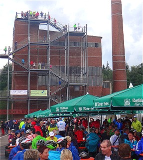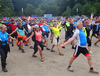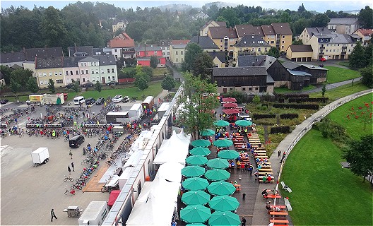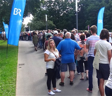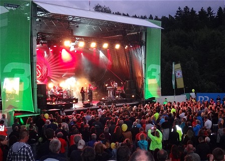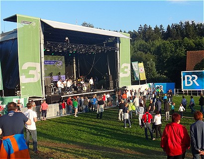 Schon im Sonderzug nach Marktredwitz kam dann die typische gute BR-Radltour-Stimmung auf, und als "alte Hasen" (2. Teilnahme) kennen wir das Prozedere jetzt ja schon: Vom Verladen der Radl über den Check-In am Startort bis zu den Übernachtungs-Modalitäten in Turnhallen und Schulen. Am Abend war dann bei sommerlichem Wetter das erste Highlight angesagt: Angeblich ließen sich 17.000 Leute das NENA-Konzert nicht entgehen und füllten den Festplatz recht gut. |
