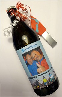 Eine "Offizielle" Radler-Halbe 2016 und eine Packung "Fahrrad-Nudeln" (wusste gar nicht, dass es so was gibt). Es war auch noch eine Glückwunschkarte dabei, die ich wegen des Urheberrechts hier leider nicht abbilden darf. Der Text (angeblich von Albert Einstein) lautet jedenfalls: "Das