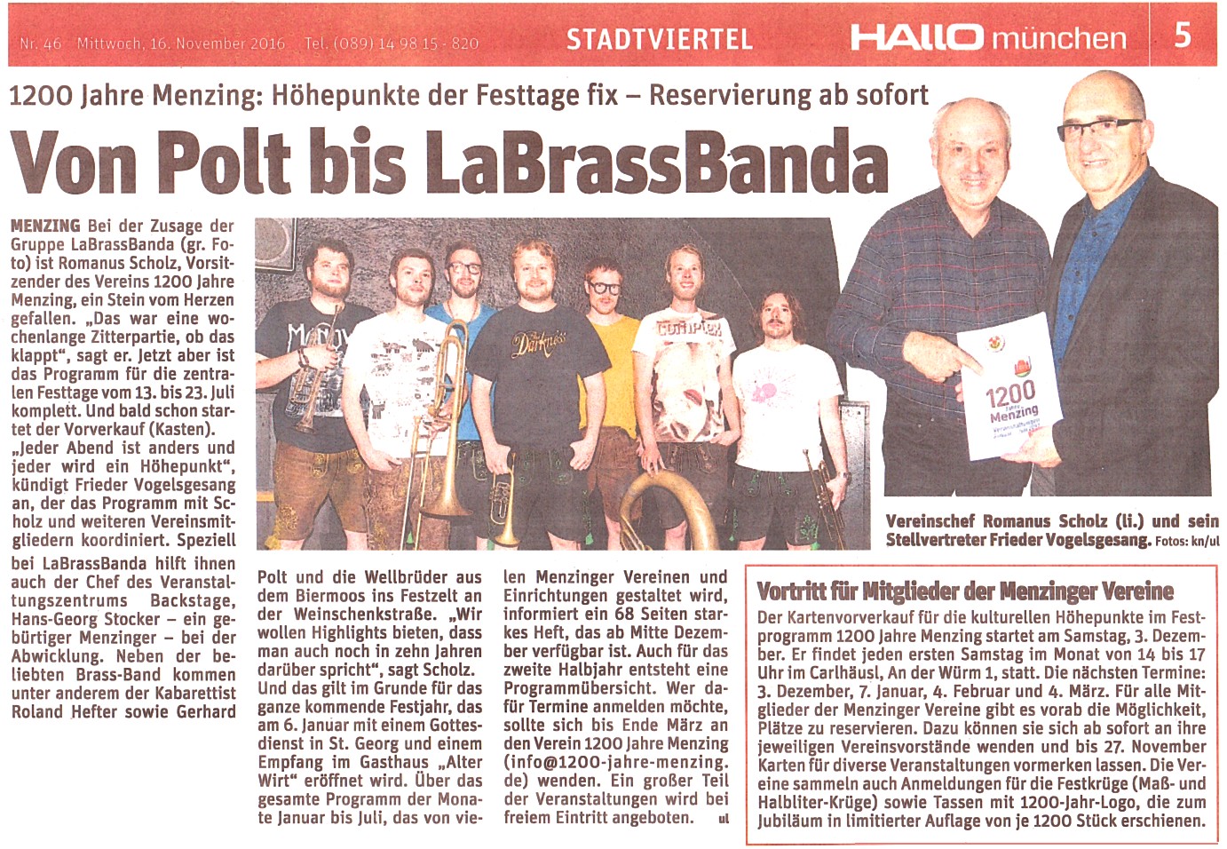 (16.11.16) Im heutigen HALLO München gibt's auf Seite 5 unter dem Titel "Von Polt bis LaBrassBanda" einen Bericht über die Höhepunkte der Festtage und Infos zum Programmheft und zum Kartenvorverkauf. |