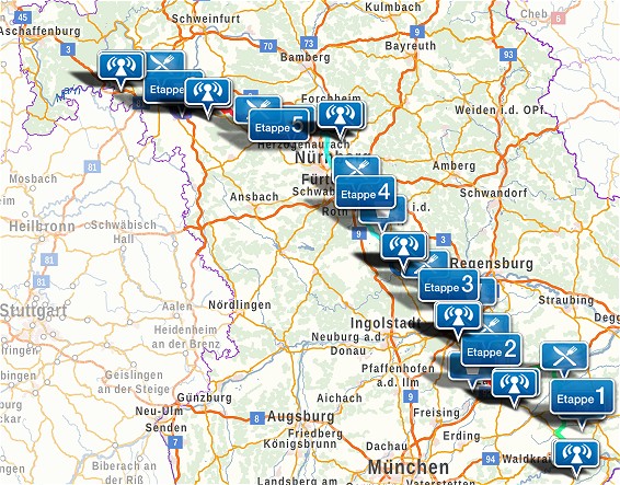 Auf der traditionellen Radlernacht im Saal des Hofbräuhauses wurde kürzlich die neue Strecke bekannt gegeben: Auf 475 km geht's von Mühldorf am Inn diagonal durch Bayern bis nach Marktheidenfeld. Einen "BR-Radltag" wie in den letzten beiden Jahren gibt's heuer nicht. Hier die offiziellen