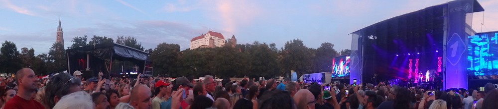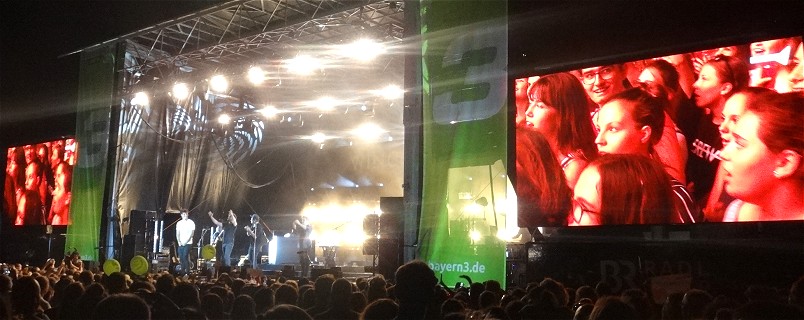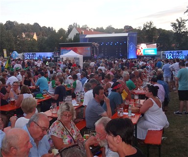 Eine große Enttäuschung war die Mittagspause bei BMW in Dingolfing: Es ging schon damit los, dass Schnecki ohne Fahrrad und ohne Tagesradler-Bändchen extreme Schwierigkeiten hatte, überhaupt aufs Werksgelände zu kommen. Und dann gab's kein Bier, sondern nur Softdrinks! Das geht bei einer Mittagspause der BR-Radltour gar nicht! Die Essensversorgung mittels Food-Trucks funktionierte auch nur schleppend, und das bei einer Firma, die auf ihrem Gelände 20 Kantinen für 15.000 Mitarbeiter betreibt. Versöhnlich stimmte nur der wahnwitzige Motorrad-Stunt eines BMW-Fahrers: Auf einer schweren Maschine drehte er freihändig Wheelies und vollführte andere unglaubliche Kunststücke. Auch die Ausfahrt durch eine der Produktionshallen war nicht uninteressant. In Landshut kamen wir dann etwas verspätet an, aber immer noch mehr als rechtzeitig für die Abendveranstaltung mit Anastacia. Die Ringelstecherwiese war schon um 19 Uhr bestens besucht. Später musste dann sogar der Einlass geschlossen werden, weil schon 15.000 Besucher auf dem Gelände waren. Der Auftritt von Anastacia war fantastisch, wahrscheinlich wird er der musikalische Top-Act der ganzen Woche bleiben. |