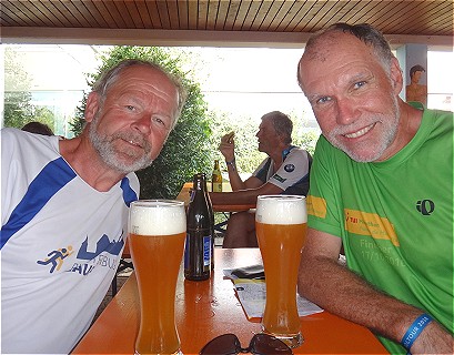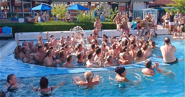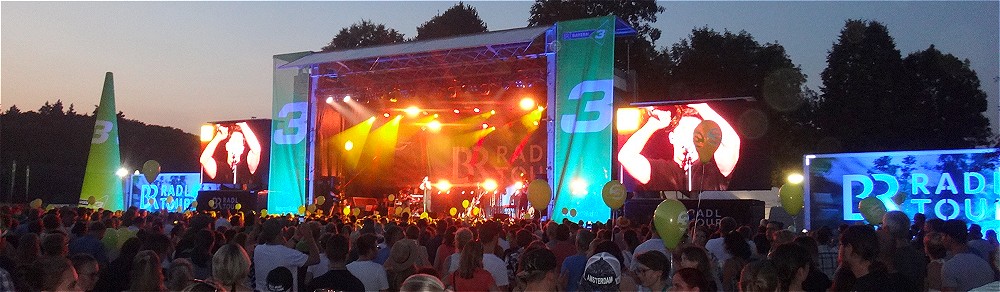 Nachmittägliches Highlight war eine unglaubliche Sause in der Therme: Da gerieten die BR-Radler außer Rand und Band, bevölkerten lautstark den Strömungskanal und warfen am Ende sogar die BR-Moderatorin Nicole Remann ins Wasser (ab min 3:50). Abends ging's dann bei einem prächtigen Sonnenuntergang dem Konzert von Nik Kershaw entgegen. Das Festgelände war für meinen Geschmack etwas überdimensioniert, und auch Nik Kershaw konnte die Massen nicht so begeistern wie tags zuvor Anastacia. Er und seine Band lieferten aber einen sauberen Auftritt ab. Da auch Jürgen vom BR dabei war, hatte ich die Ehre, Uli Wenger, den "Mr. One Hit Wonder", kennenzulernen. Tom Glas sorgte wieder für ein gelungenes DJ-Finish. |
