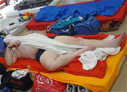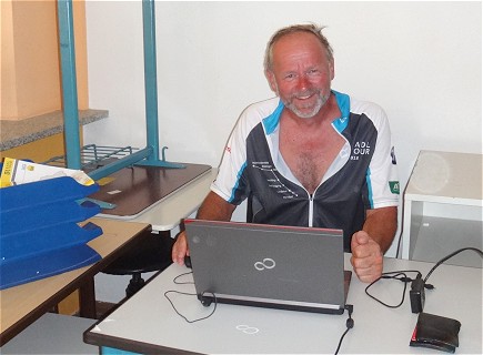 Heute sind wir in Berching nicht in einer Turnhalle einquartiert, sondern in einer Schule, sprich: in einem Klassenzimmer. Ich hab' mir gleich das Lehrerpult als "Office" geschnappt, um die erste Berichterstattung zu beginnen. Bisher hab' ich keine Zeit dafür gefunden. Auch die 3. Etappe ist bei strahlendem Sonnenschein und knapp 40 Grad bestens gelaufen. |