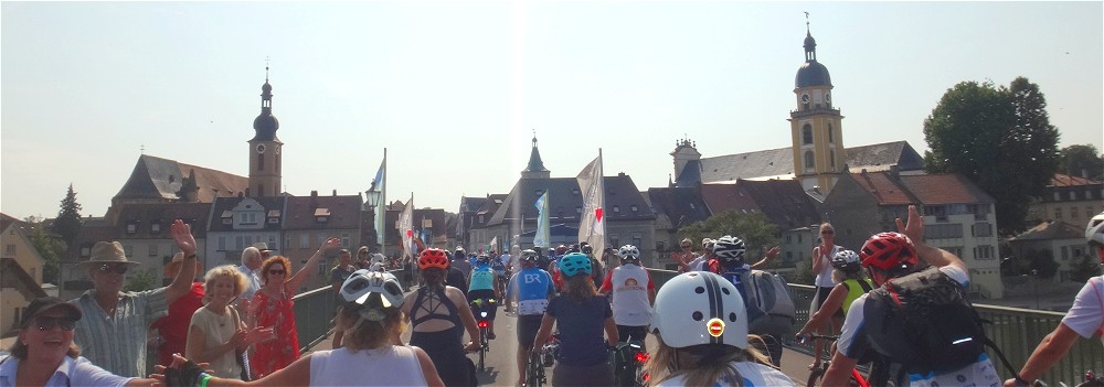 Heute war unser letzter voller Radltag - wieder bei Traumwetter, nachmittags sogar bei extremer Hitze. Aber mittags hatten wir uns ja am Erlabrunner Badesee abkühlen können. Die Zieleinfahrt in Marktheidenfeld war natürlich ein Highlight der gesamten Woche. Abends heizte Nico Santos ordentlich ein, und dann war natürlich ein finaler Absacker am Weinzelt angesagt ... |