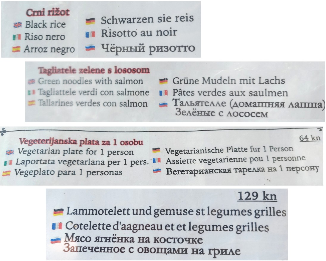 --- Update 21.08.: Heute mal keine touristischen Hinweise, sondern Auszüge aus einer kroatischen Speisekarte, sowie eine urlaubsgerechte Interpretation der 3-G-Regel (funktioniert übrigens auch ohne Urlaub): --- Update 20.08.: Momentan sind wir auf der Insel Brač, und da konnten wir heute 2 Rekorde verbuchen: Zuerst waren wir auf der Vidova Gora, der mit 780m höchsten Erhebung aller Adria-Inseln, und konnten dort einen tollen Rundblick auf den Ort Bol und die Insel Hvar genießen, und kaum eine Stunde später waren wir dann unten auf Höhe 0 am berühmtesten Strand Kroatiens, dem "Goldenen Horn" bzw. dem Zlatni Rat, einem 300m langen Kies-Zacken, der seine Form immer wieder etwas verändert, aber komischerweise nie komplett weggespült wird. Für die weitere Reiseplanung mussten wir heute auf "Plan B" umschalten, denn die kleine Fähre nach Makarska ist übers Wochenende komplett dicht. Wir setzen morgen also wieder nach Split über und fahren auf der Küstenstraße weiter. Ca. 100 km Umweg, aber es ist egal! Hier ein paar aktuelle Fotos:
