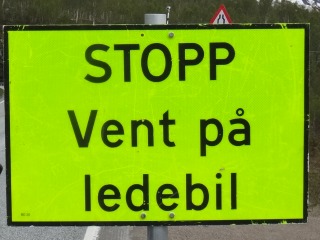 Was muss man hier tun, außer anzuhalten? Man muss auf das Führungsfahrzeug warten - und diesem dann folgen. Wird meist bei Arbeiten in Tunnels verwendet. Im Tunnel ist es einspurig, und das "Ledebil" leitet die Auto-Konvois von beiden Seiten abwechselnd durch. Die Norweger haben das System perfektioniert: Neben dem Ledebil fährt ein Schlussfahrzeug dem Konvoi hinterher. Am anderen Ende des Tunnels angekommen, wird das Schlussfahrzeug zum Ledebil für die Gegenrichtung. Das bisherige Ledebil fährt bis zum Ende der Autoschlange und wird dann Schlussfahrzeug. Ganz schön aufwändig! Man fragt sich manchmal, ob's nicht auch eine Baustellenampel täte. |